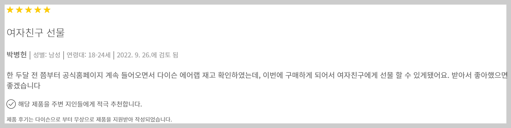 그만큼 만족도가 너무 높은 제품임에는 틀림없네요. 하지만 내돈내산은... 솔직히 선뜻 사기 힘든 금액이니 만족도 99%의 좋은 선물 아이템이라고 생각합니다. ^^ 선물로 강추!
