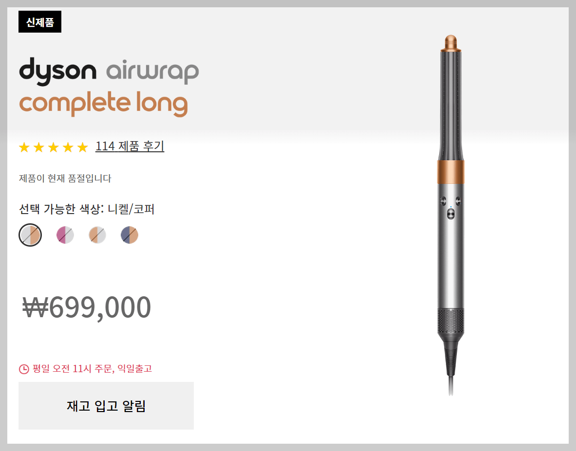 다이슨의 마케팅 전략 같아 보이는 일시 품절이 너무 빈번하기에 특히 뉴 다이슨 에어랩 멀티 스타일러 컴플리트 롱을 구하기가 매우 어렵습니다. 그러므로 공식 홈페이지에 재고가 있을 경우 일단 구매하시고 어떻게 할지 생각하셔도 됩니다.