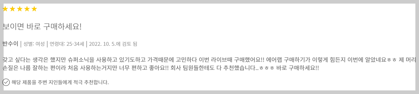 위에 언급한 단점과 불편한 점은 뉴 다이슨 에어랩의 편리함과 혁신에 비하면 정말 사소합니다. 저도 억지로 찾으려 노력하며 작성하였음을 알려드립니다.