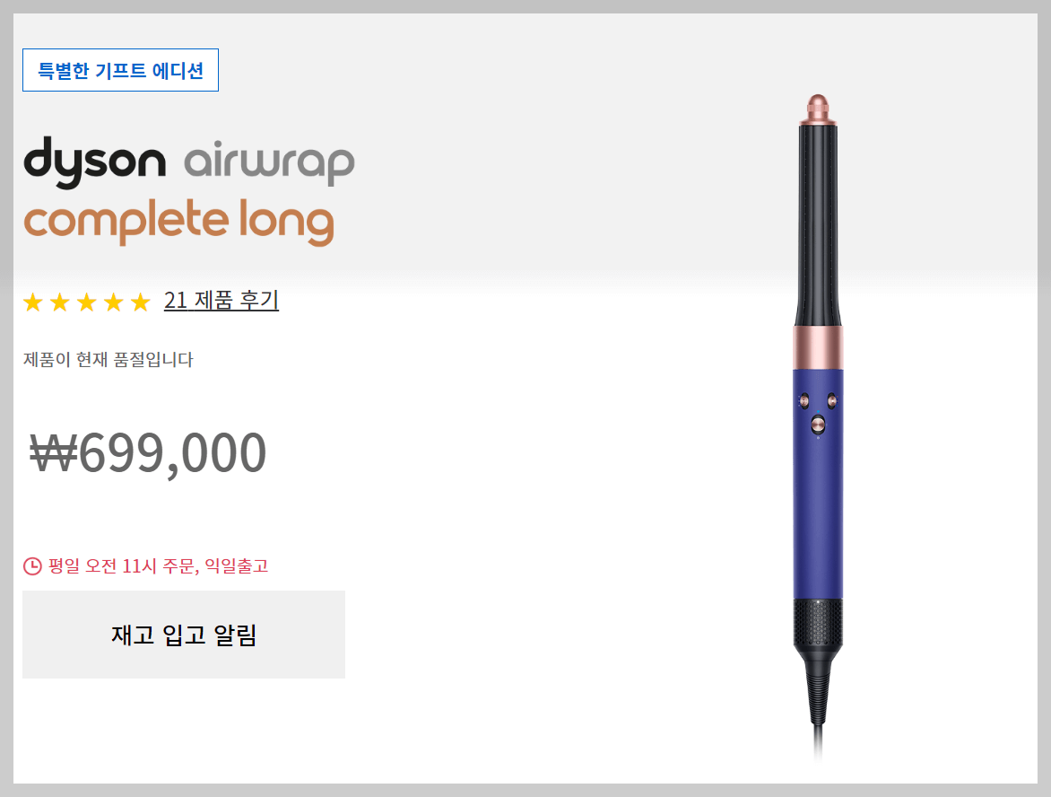 다이슨의 마케팅 전략 같아 보이는 일시 품절이 너무 빈번하기에 특히 뉴 다이슨 에어랩 멀티 스타일러 컴플리트 롱을 구하기가 매우 어렵습니다. 그러므로 공식 홈페이지에 재고가 있을 경우 일단 구매하시고 어떻게 할지 생각하셔도 됩니다.