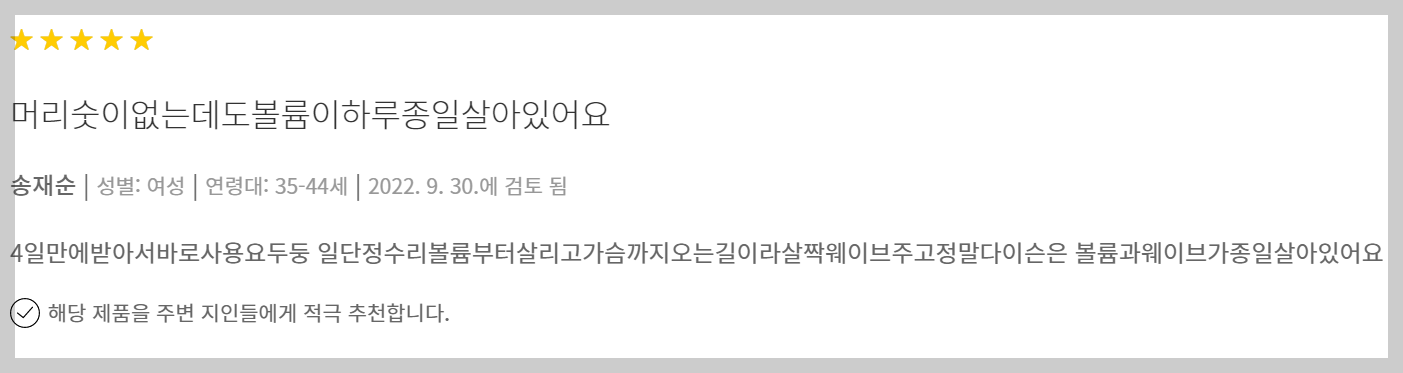 불편한 점으로는 숏(일반)과 롱 둘 다 젖은 머리에 사용하라고 하나, 그렇다고 머리 감은 후 어느 정도 말린 후 바로 사용하기에는 잘 달라붙지 않습니다. 그래서 멀티 스타일러 본체에 달라붙을 정도로 적당히 잘 말려야 하는데 이것이 좀 어렵습니다. 저는 그래서 차라리 완전히 마른 머리에 분무기를 이용하여 머리를 촉촉이 만든 후 사용하는 게 더 편합니다.