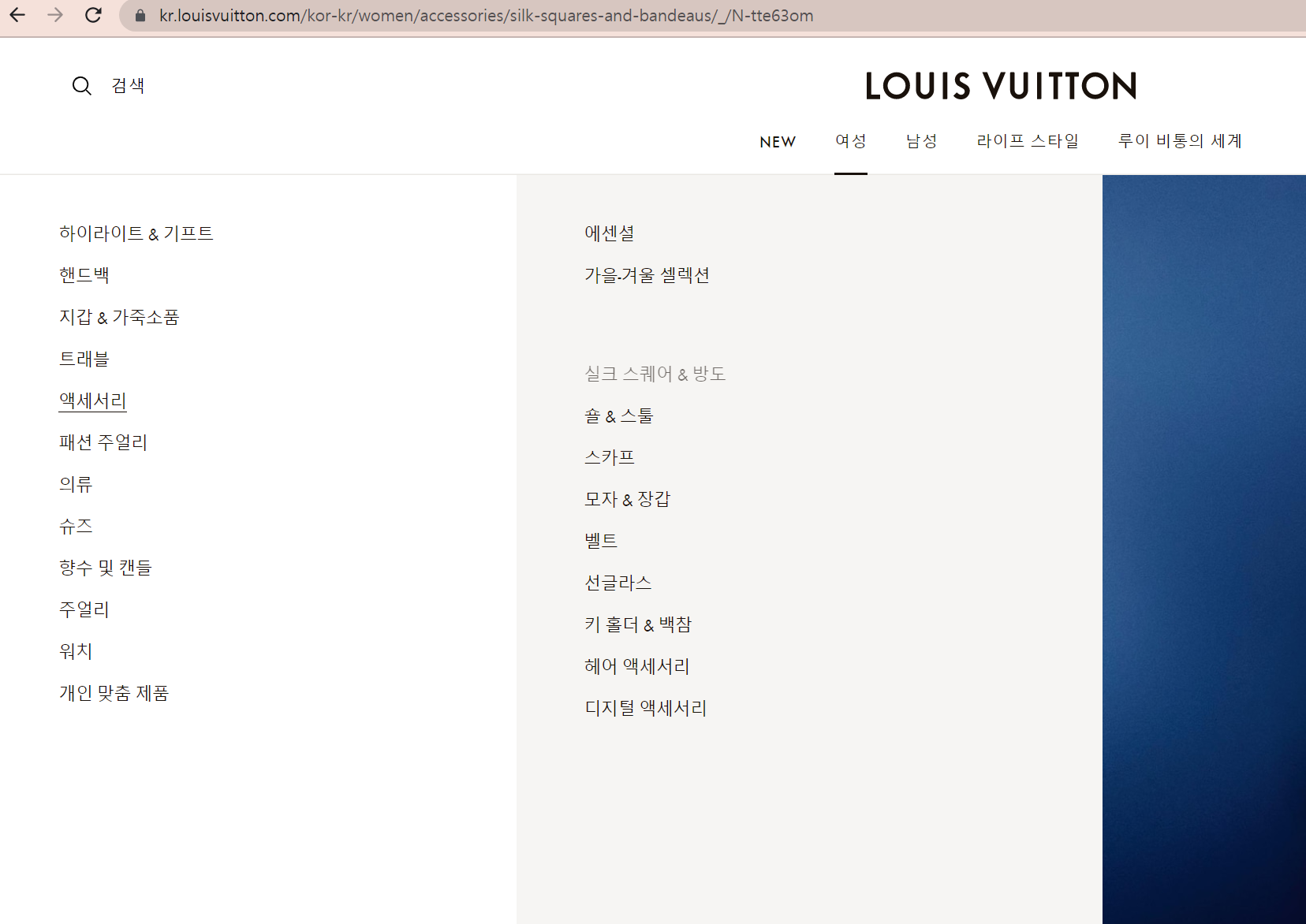 여성 -> 액세서리 -> 실크 스퀘어 & 방도에서 확인 가능합니다.
