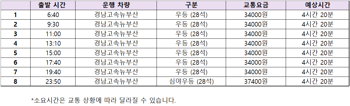 • 운임 요금은 일반 우등 34,000원 /심야 우등은 37,400원입니다. 예상 소요시간은 4시간 20분입니다.