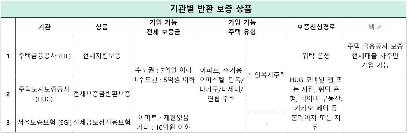 - 반환보증 상품을 가입할때, 주택 유형, 보증금액 등을 고려하여 본인에게 유리한 보증기관을 선택하시면 됩니다.