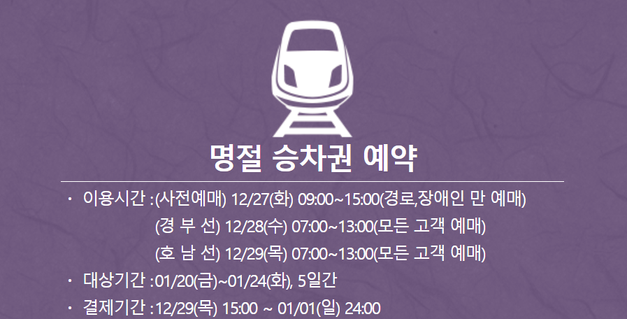 - 호남선 열차 12/29 (목) 오전 7시 ~ 오후 1시 (모든 고객 예매 가능)