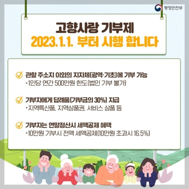 - 일본 제도 중 하나인 고향납세제와 유사한 제도로, 2023년 1월 1일부터 시행될 예정인 고향사랑 기부제는 주소지가 아닌 곳의 지방자치 단체에 자발적으로 기부를 유도하는 제도입니다.