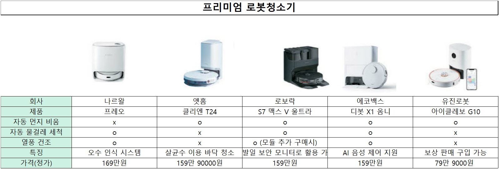 표를 보셔도 아시겠지만, 자동 먼지 비움, 자동 물걸레 세척, 열풍 건조 (모듈 추가시 가능) 모두 가능한 제품입니다. 자동 물걸레 세척 기능이 있는 청소기를 한번 사용해 보신 분들은 다른 청소기는 사용하기 힘들정도라고 합니다.
