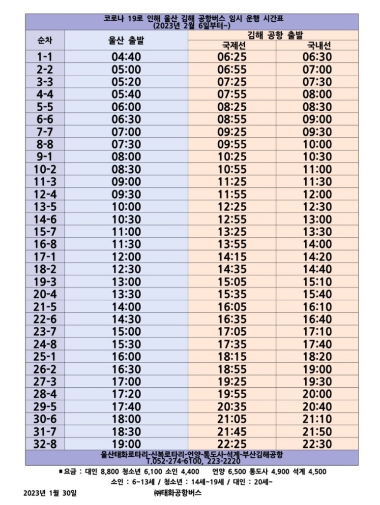 2023년 2월 6일부터 하기와 같이 울산 - 김해공항 리무진 공항버스의 시간표가 변경됩니다.