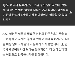 제가 학회 참석으로 11월 후쿠오카를 가야해 비행기 예매를 하려고 여권을 보니 만료기간이 12월이었어요. 그래서 부랴부랴 검색하였고, 주부산일본국총영사관의 Q&A에서 일본은 입국에 필요한 여권의 잔존유효기간을 별도로 정하고 있지 않아 만료 기간이 남아있다면 입국이 가능하다는 것을 알게 되었답니다.