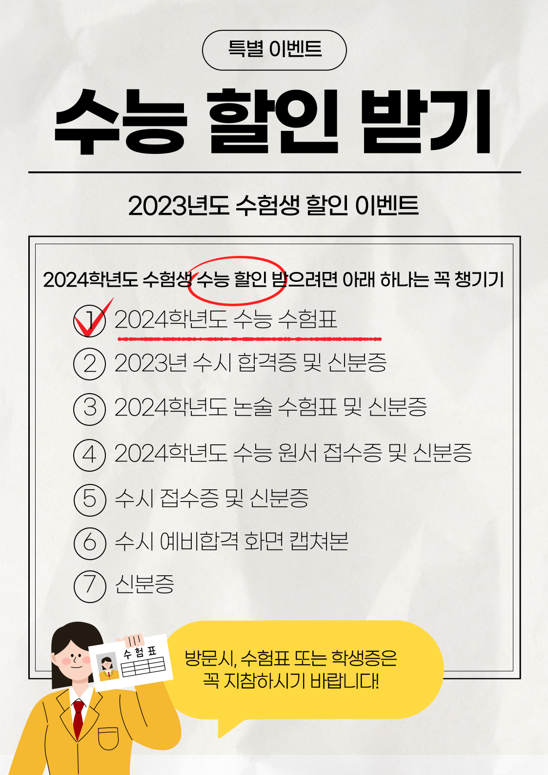 먼저 수능 할인을 받기 위해서는 아래 하나는 꼭 챙기셔야 합니다. 수험표는 보관하거나 사진으로 찍어놓기 바랍니다.