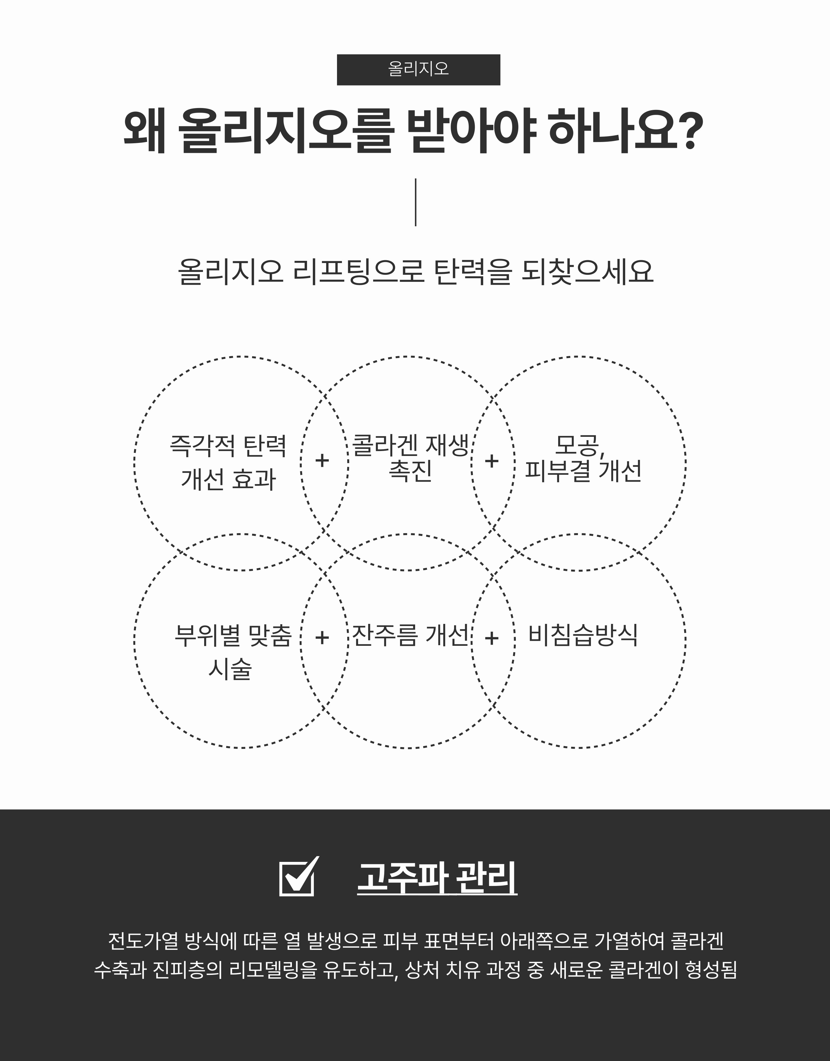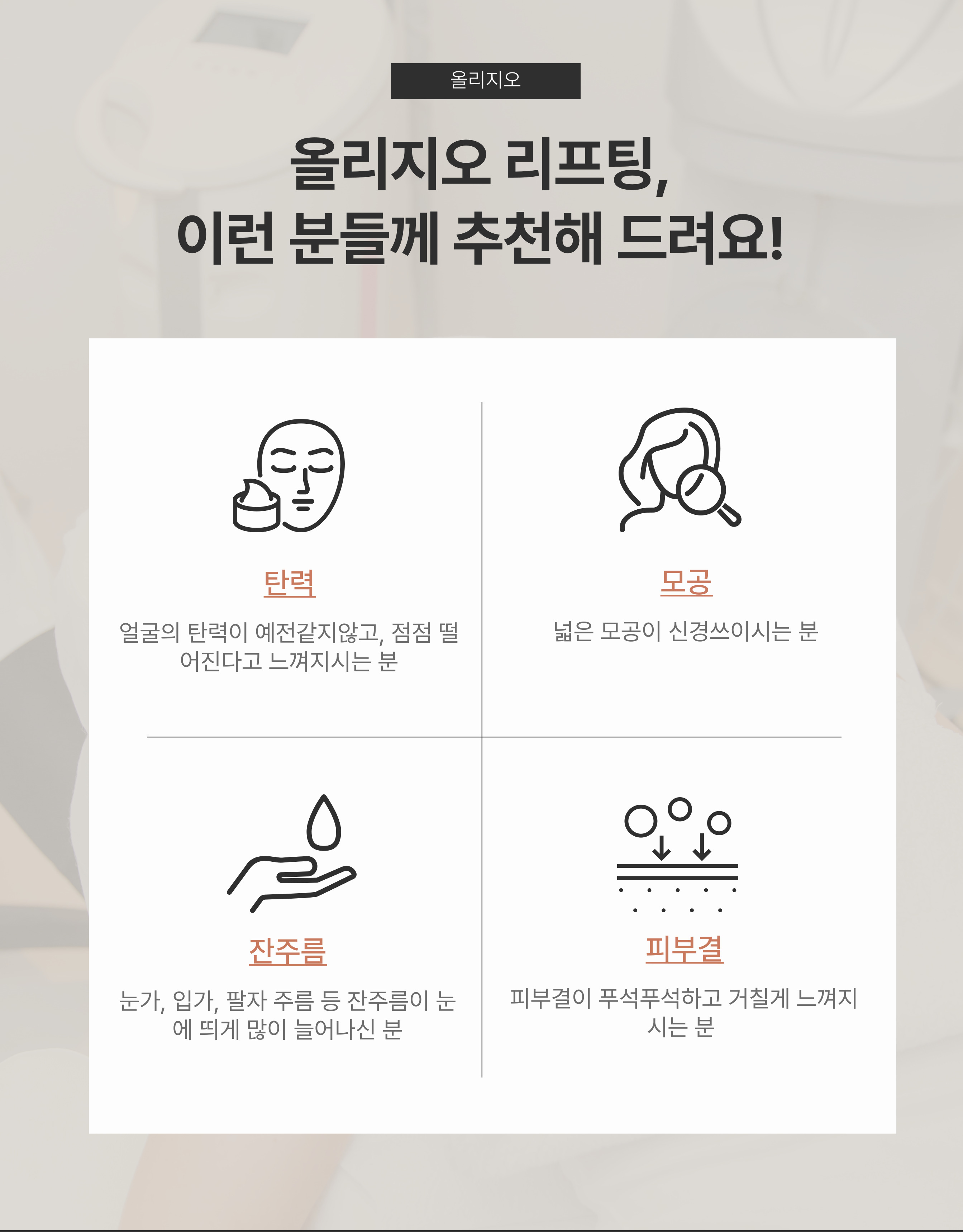 올리지오 시술 직후부터 피부 속 콜라겐이 생성되면서 잔주름개선에 도움을 주며, 탄력있는 피부로 유지시켜 줍니다.