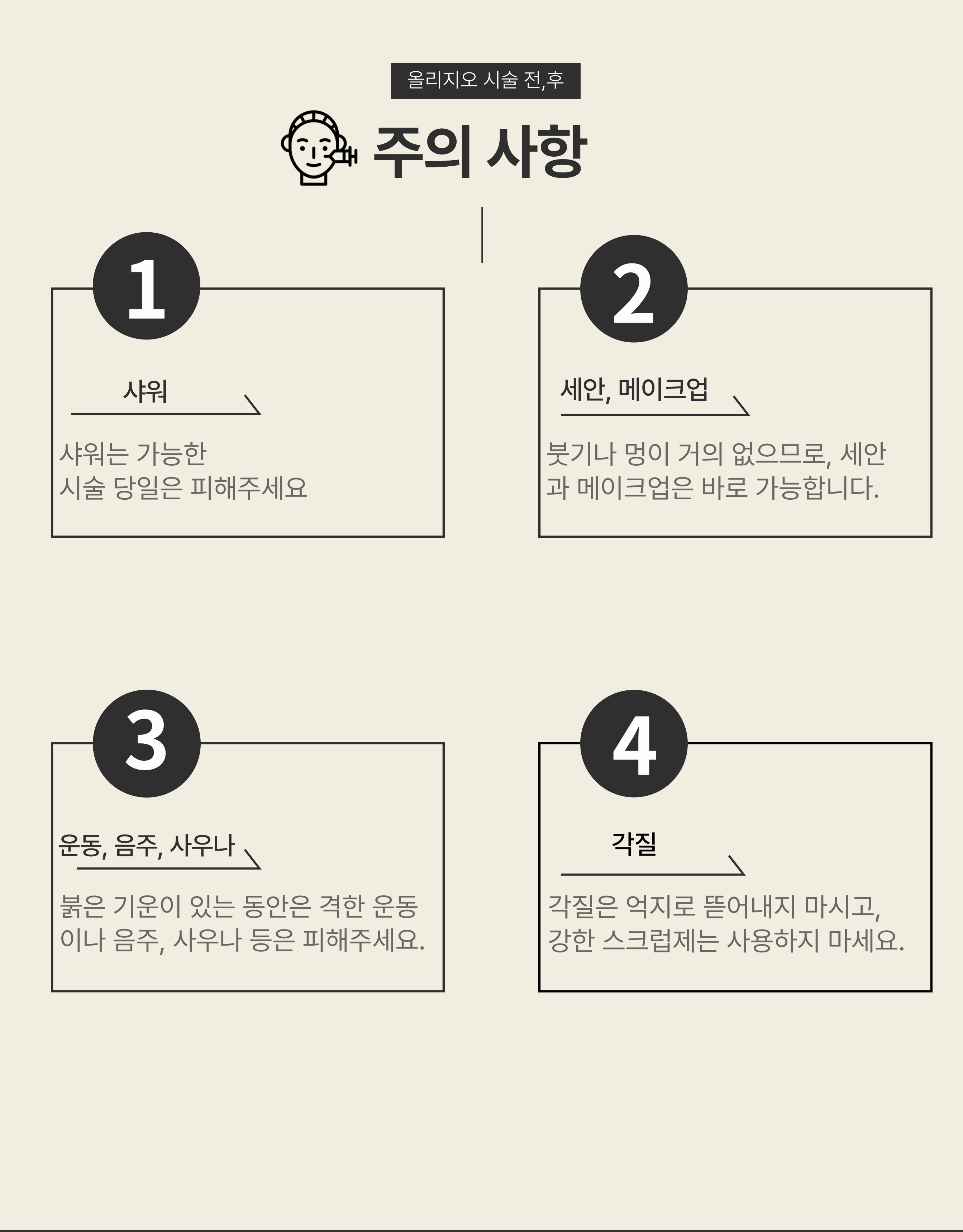 • 샤워 : 샤워는 가능한 시술 당일은 피해주세요.